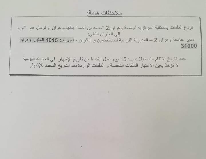 اعلان عن توظيف بجامعة محمد بن احمد بولاية وهران