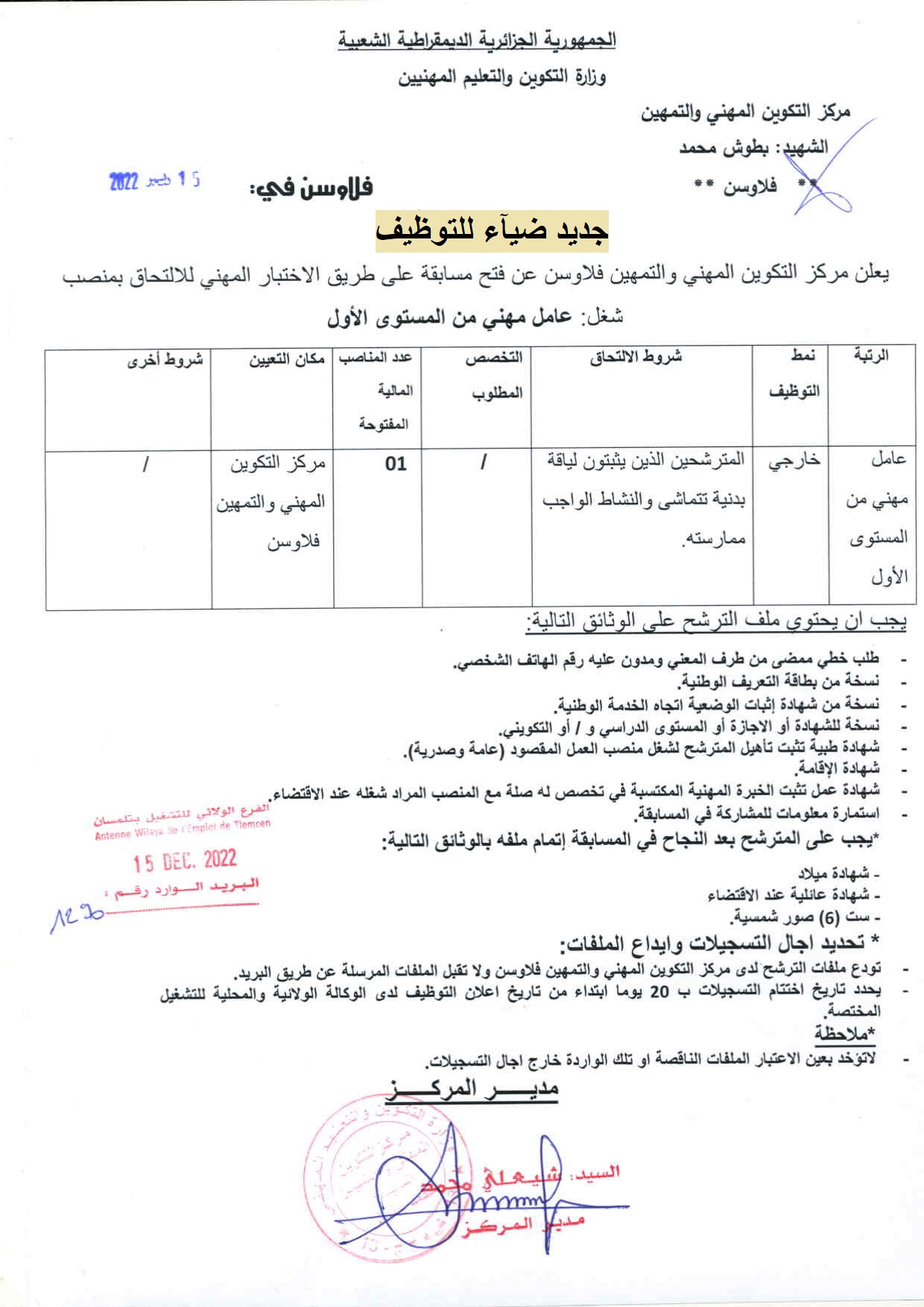 اعلان عن توظيف بمركز التكوين المهني والتمهين الشهيد بطوش محمد بفلاوسن بولاية تلمسان