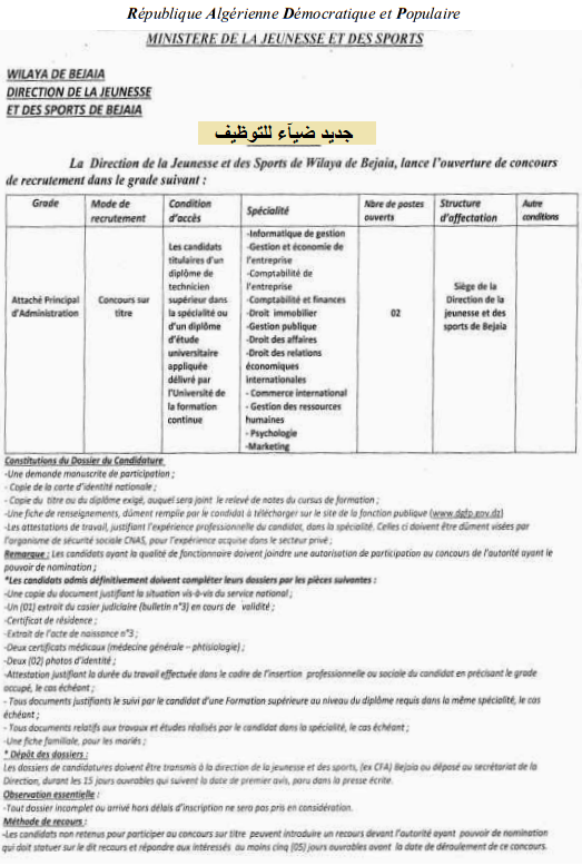 تعلن مديرية الشباب والرياضة لولاية بجاية عن فتح مسابقة على أساس الشهادة للتوظيف في الرتب المبينة أدناه: