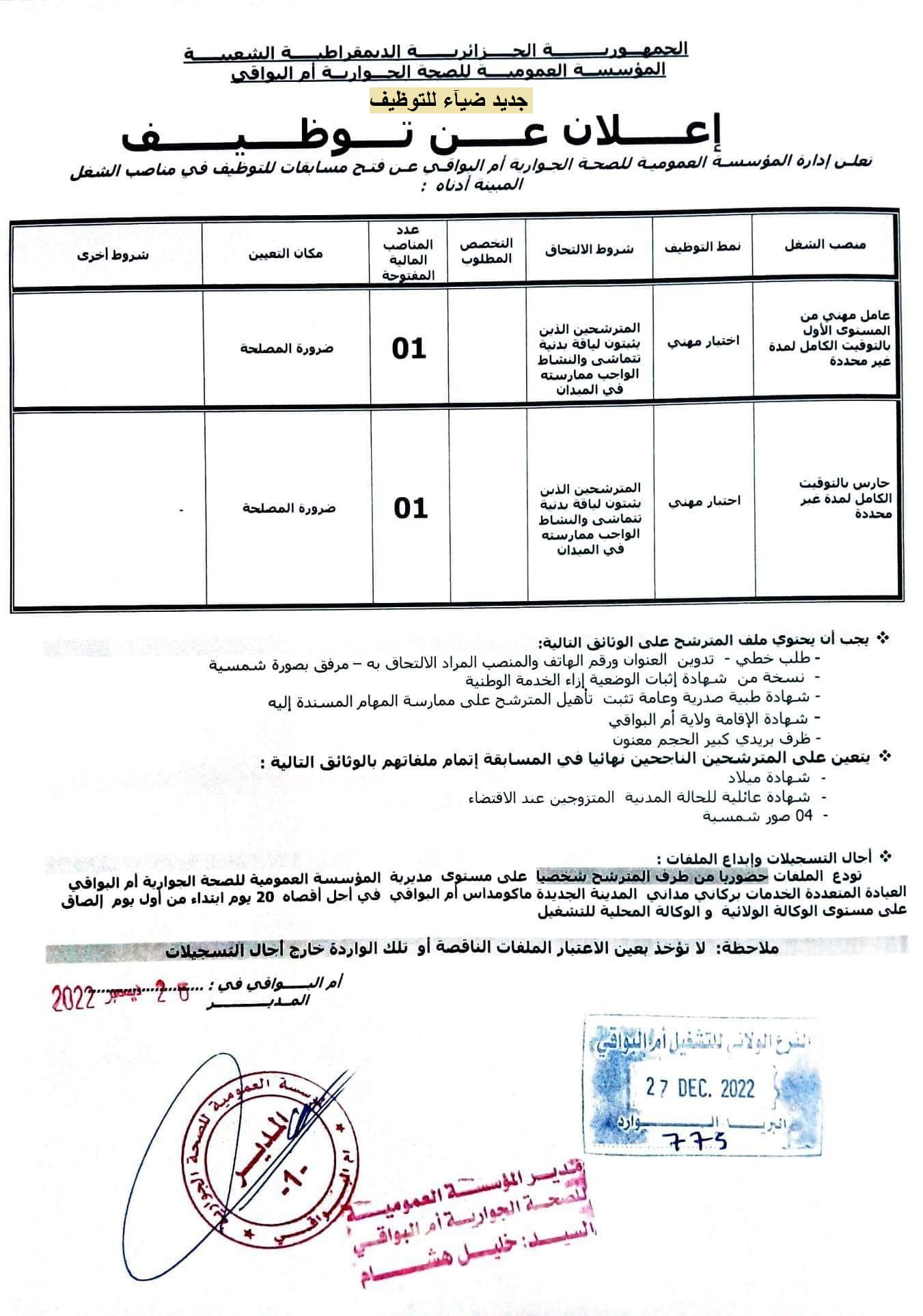 اعلان عن توظيف بالمؤسسة العمومية للصحة الجوارية بولاية ام البواقي