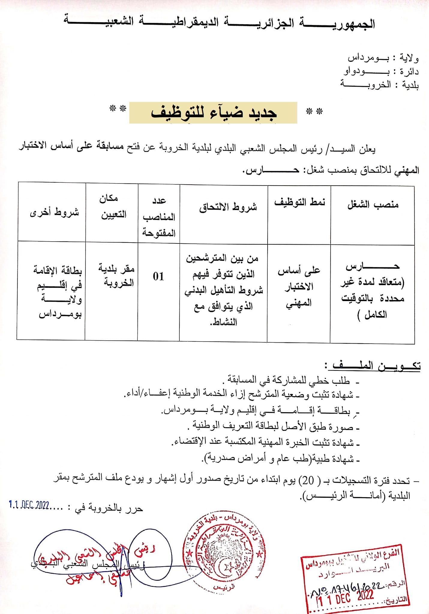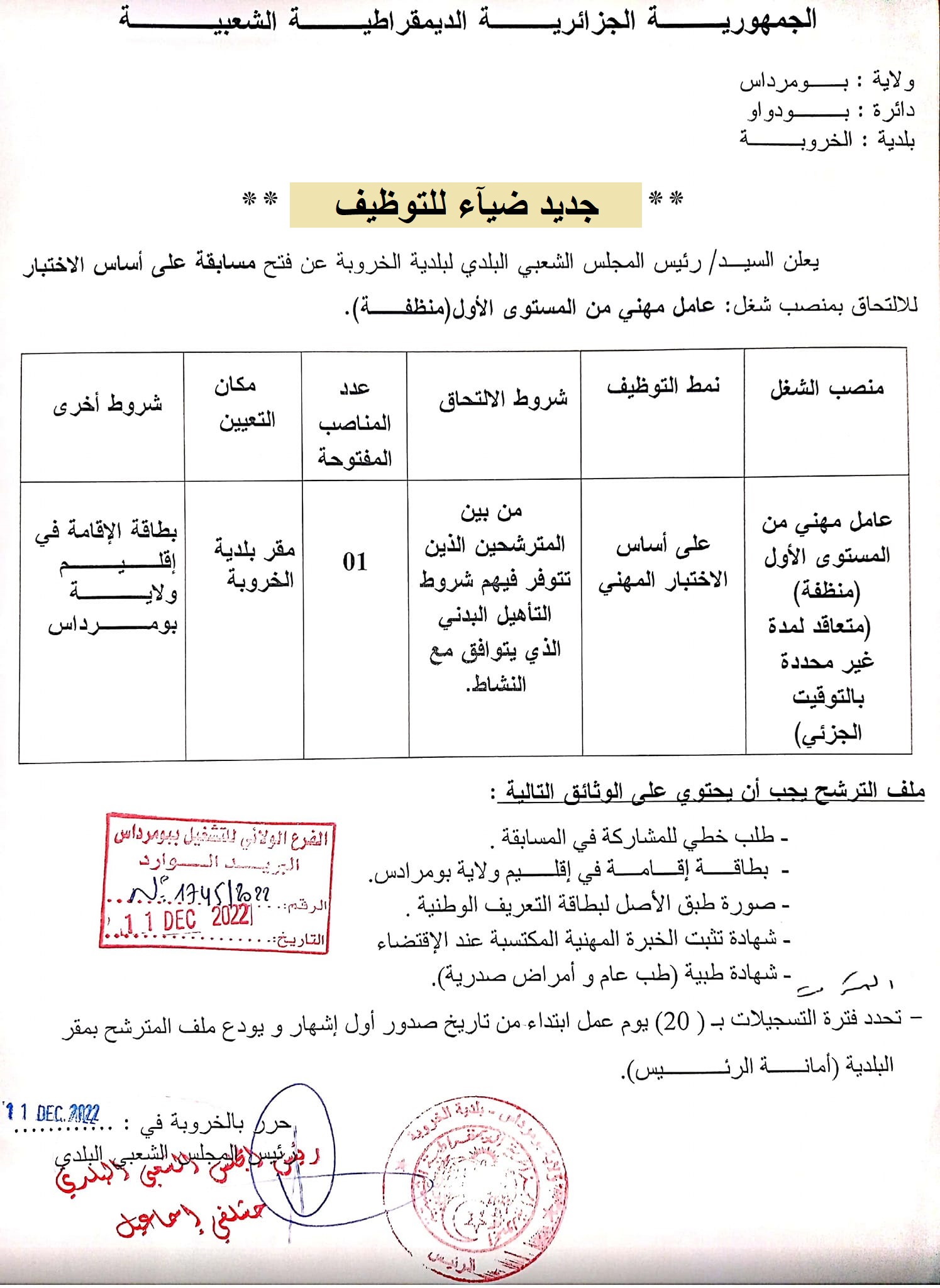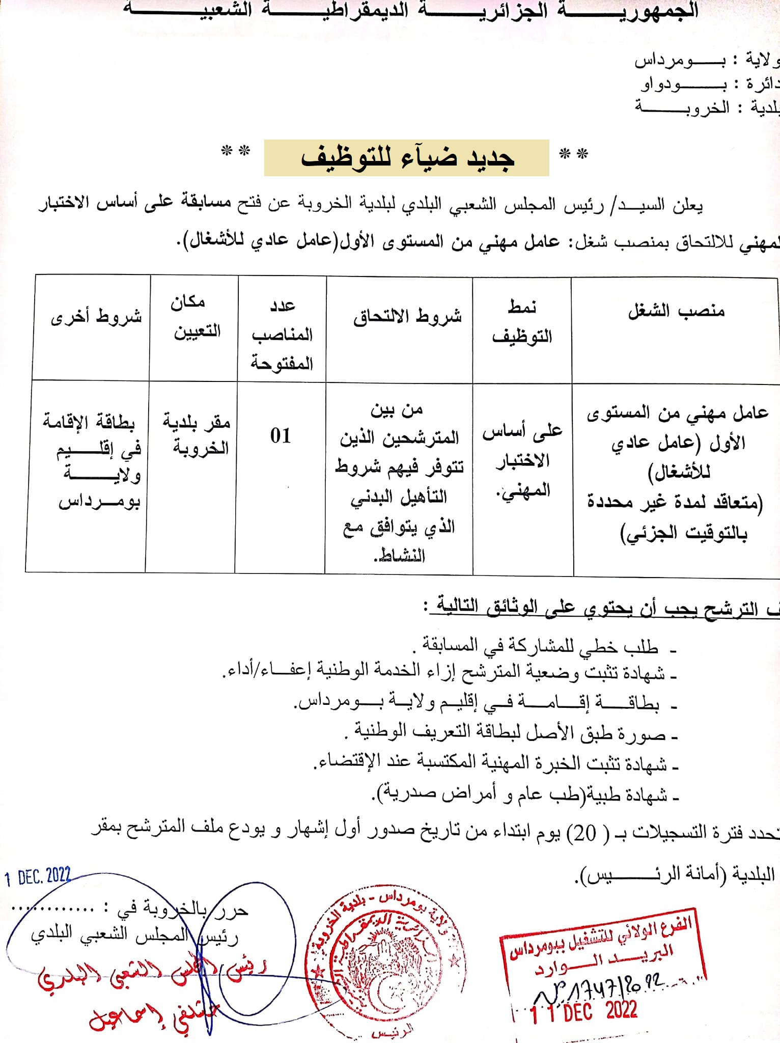 اعلان عن توظيف ببلدية الخروبة بولاية بومرداس