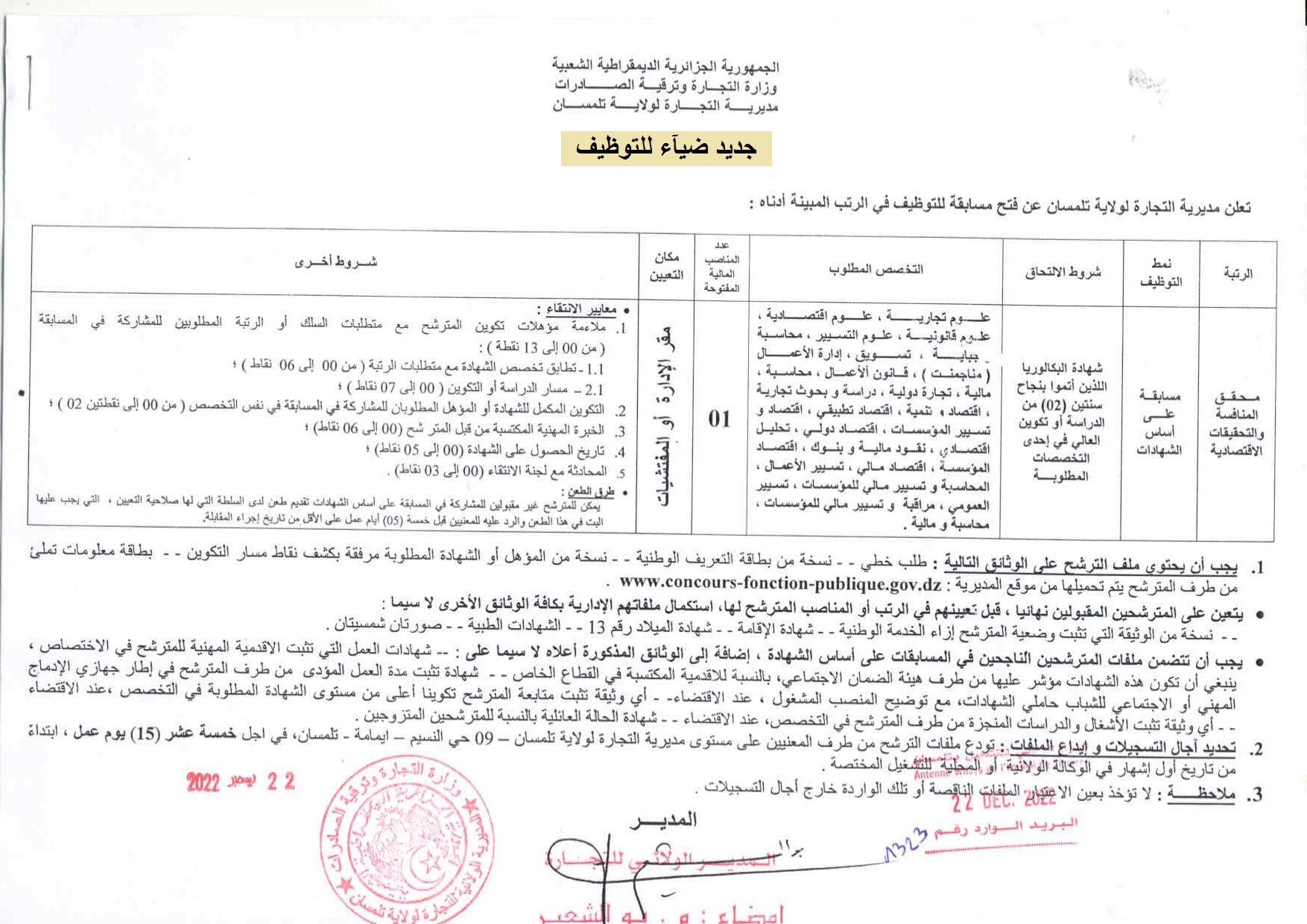 تعلن مديرية التجارة لولاية تلمسان عن فتح مسابقة على أساس الشهادة للتوظيف في الرتب المبينة أدناه: