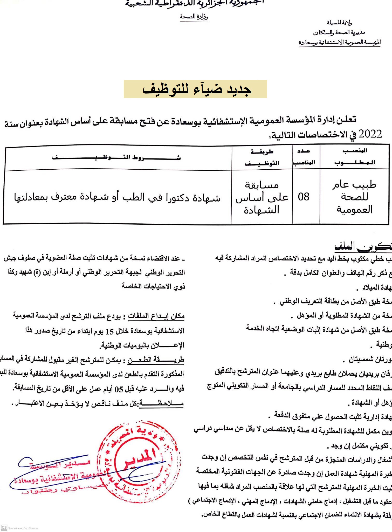 اعلان عن توظيف بالمؤسسة العمومية الاستشفائية ببوسعادة بولاية المسيلة