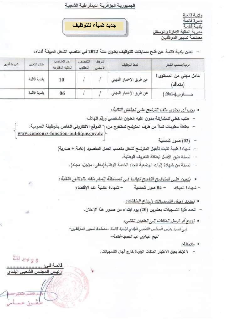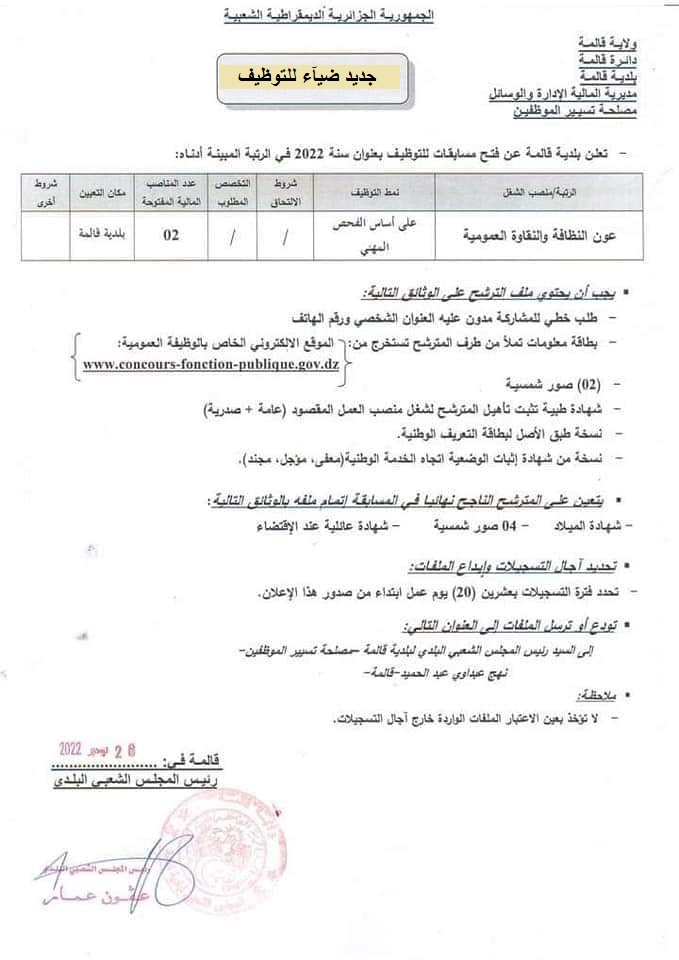 اعلان عن توظيف ببلدية قالمة
