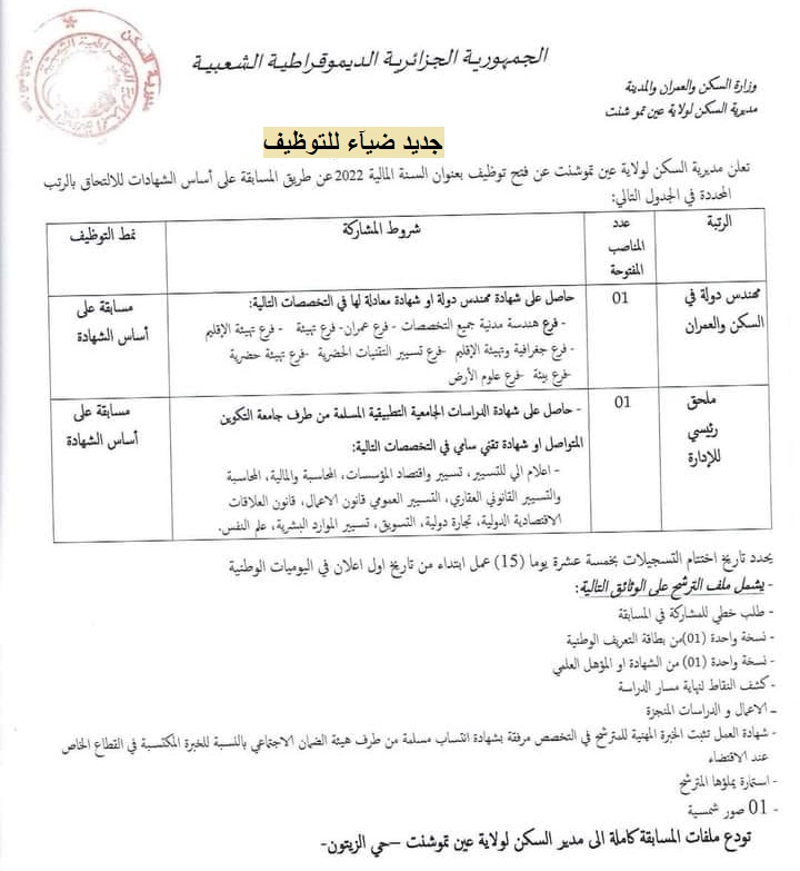 تعلن مديرية السكن بولاية عين تموشنت عن فتح مسابقة على أساس الشهادة للتوظيف في الرتب المبينة أدناه: