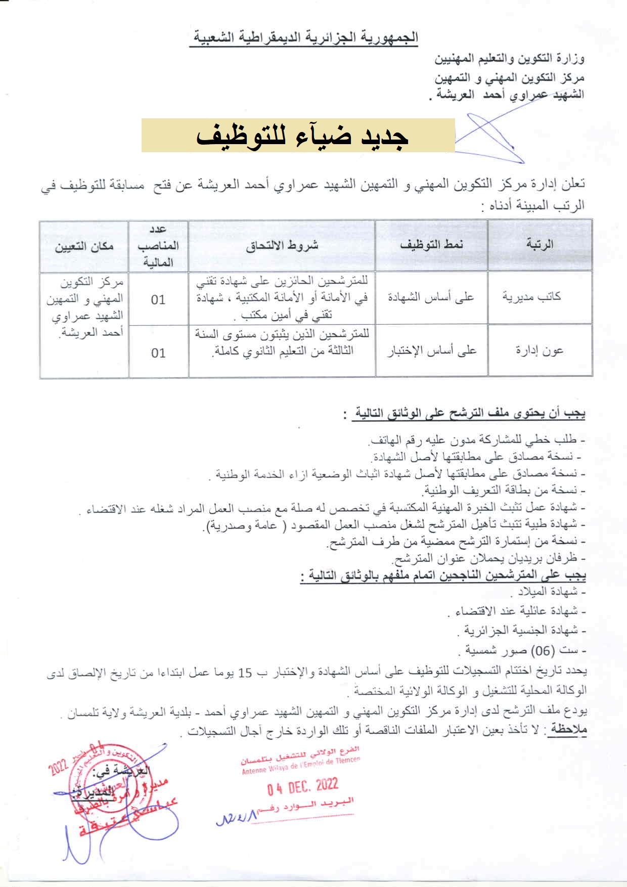 اعلان عن توظيف بمركز التكوين المهني والتمهين بالعريشة بولاية تلمسان