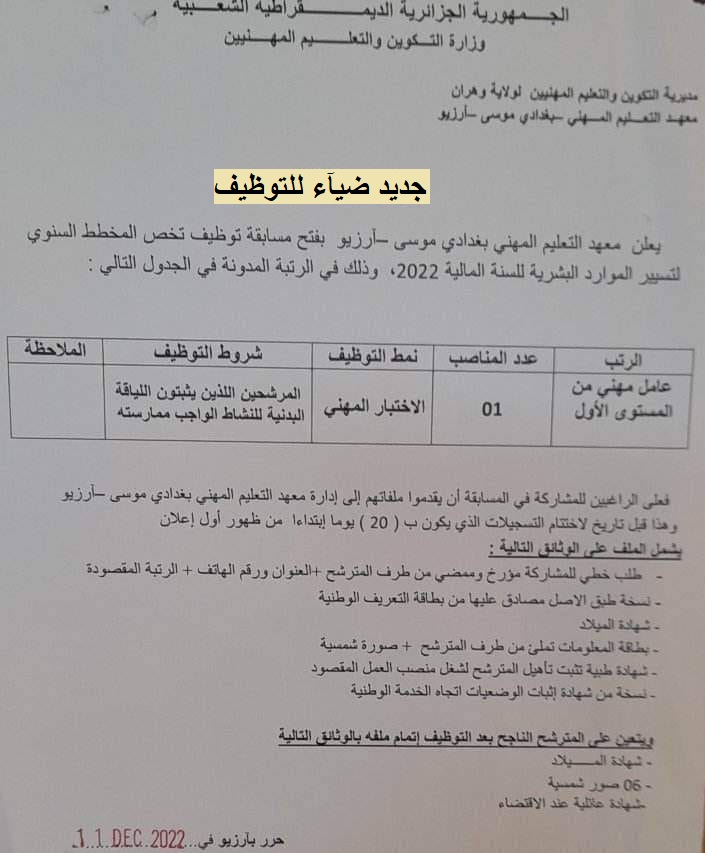 اعلان عن توظيف بمعهد التعليم المهني بغدادي موسى بأرزيو بولاية وهران