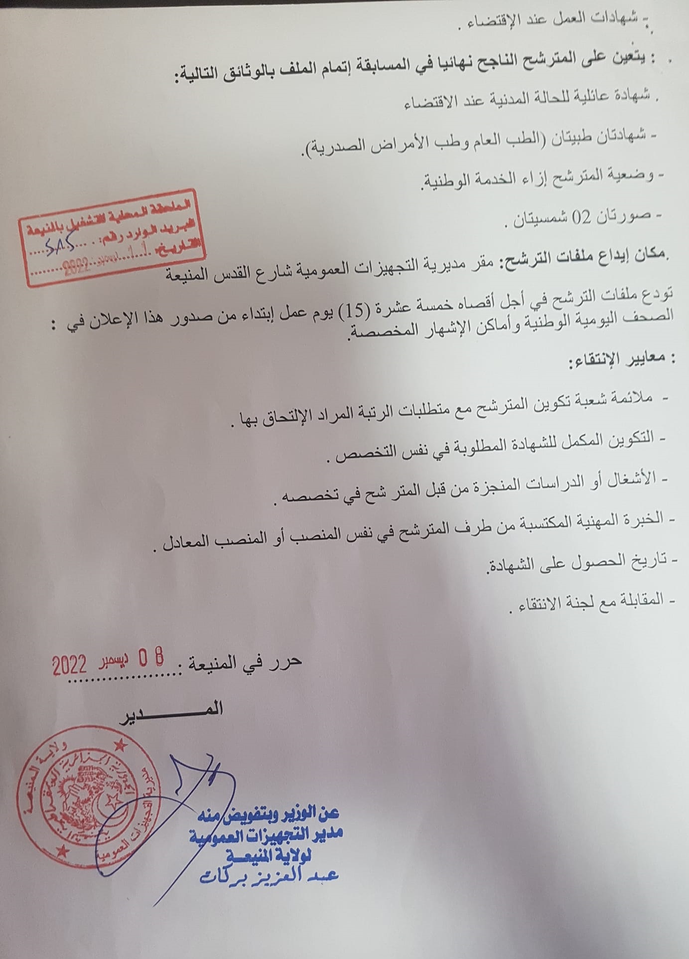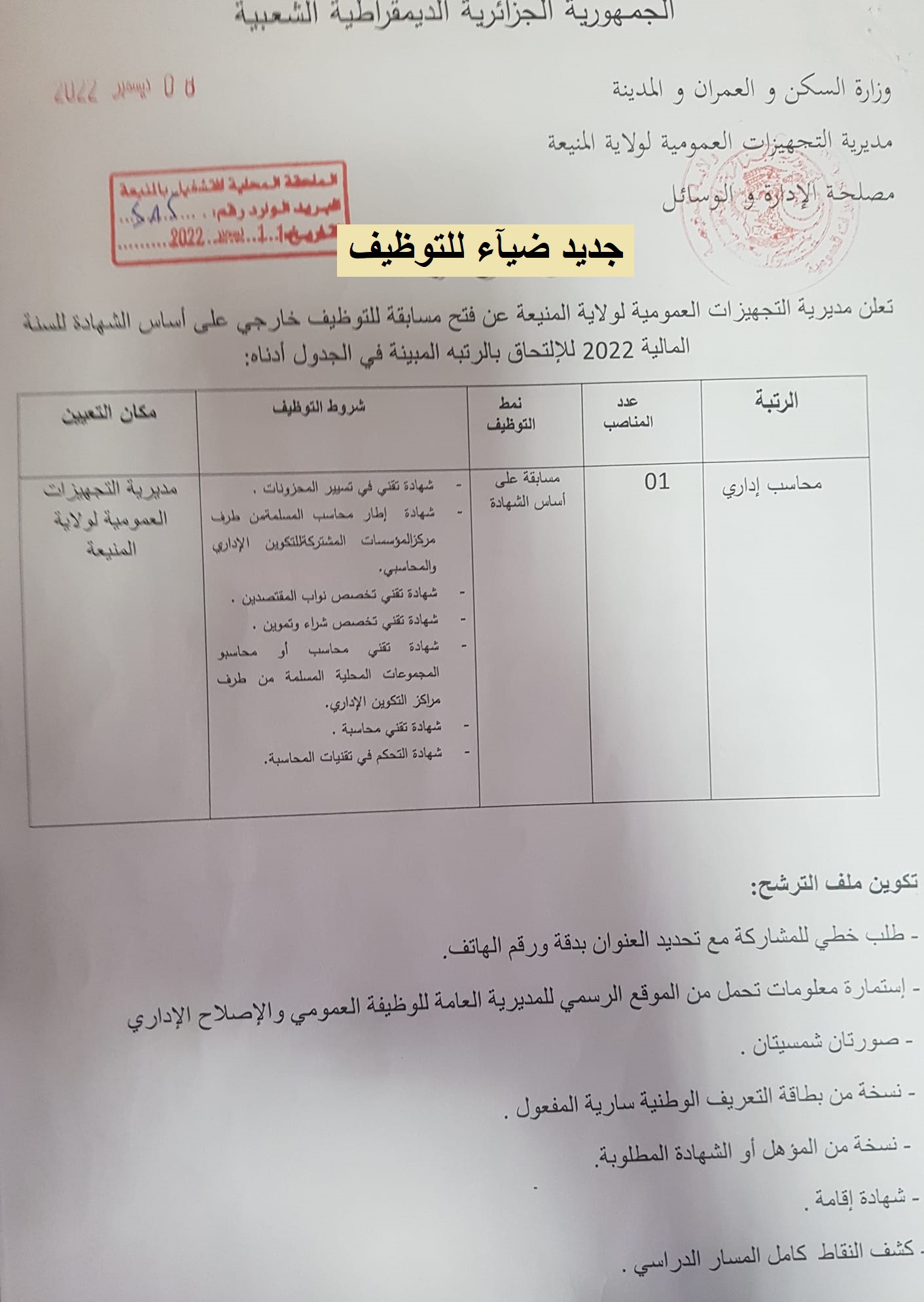 اعلان عن توظيف بمديرية التجهيزات العمومية لولاية المنيعة
