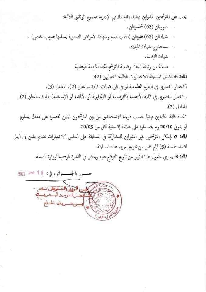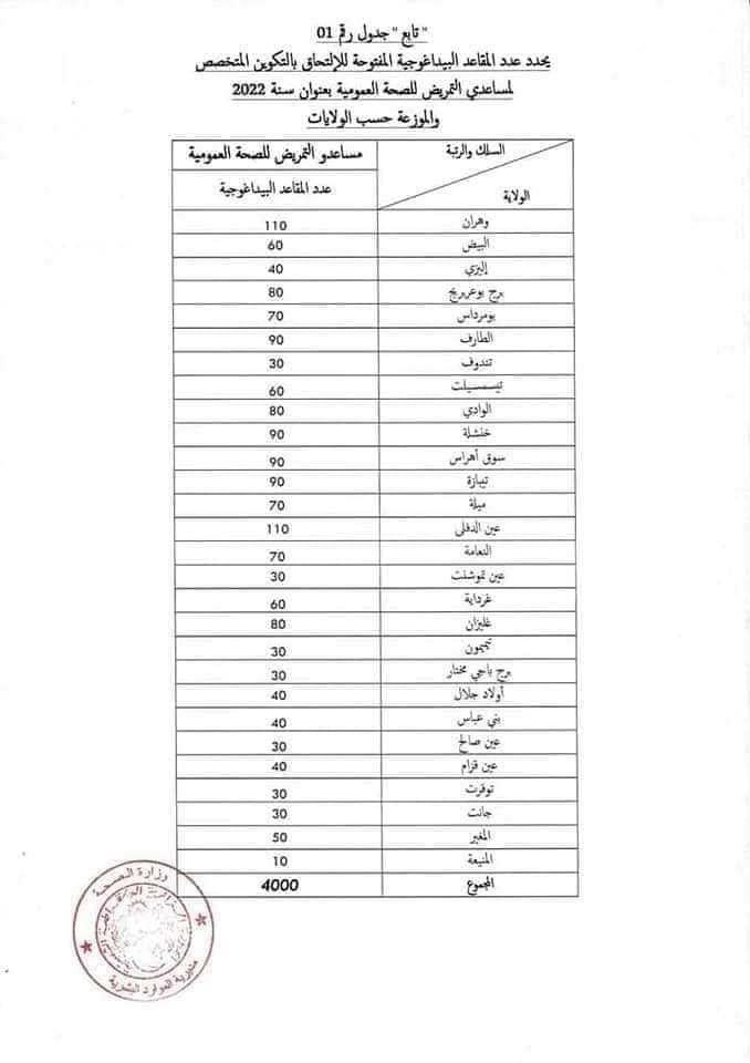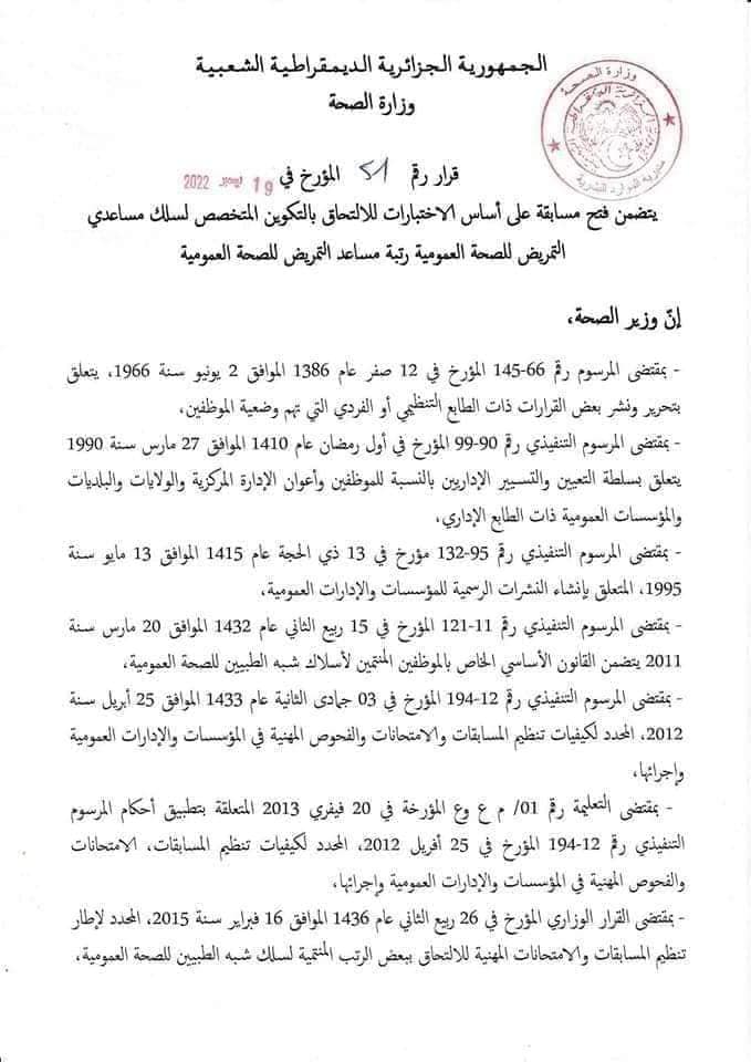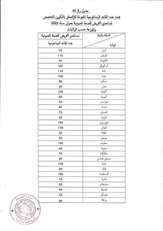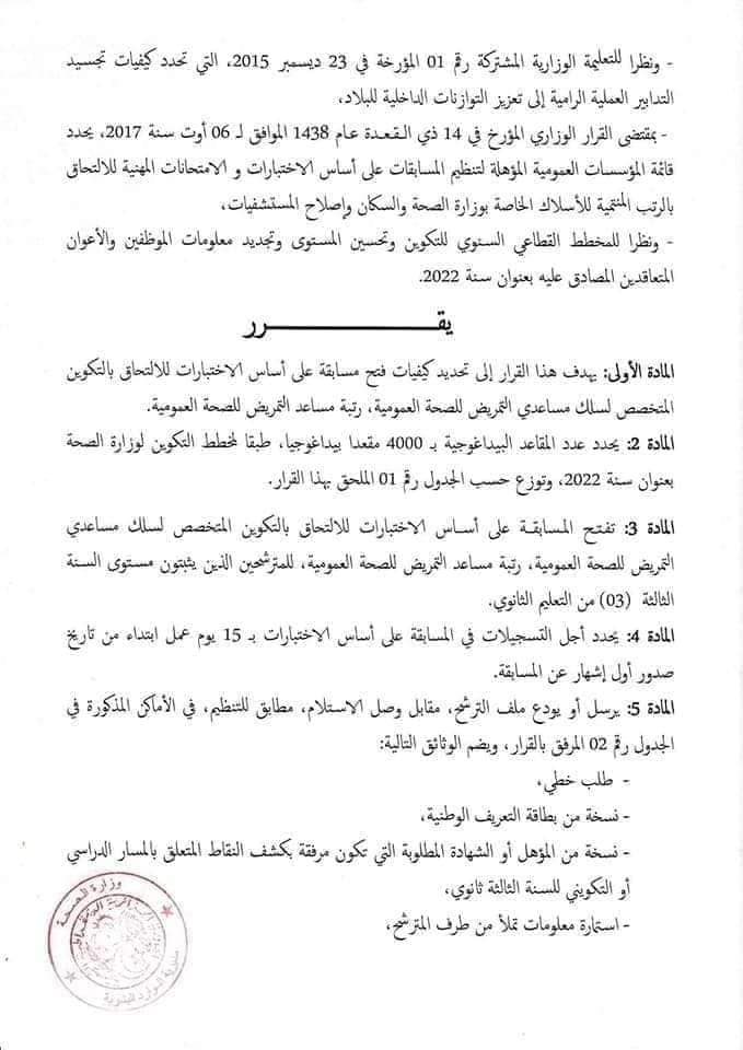 المراسلة الخاصة بفتح مسابقة للالتحاق بالتكوين في رتبة مساعدي التمريض وعدد المناصب الممنوحة لكل ولاية و كذلك مراكز إيداع الملفات