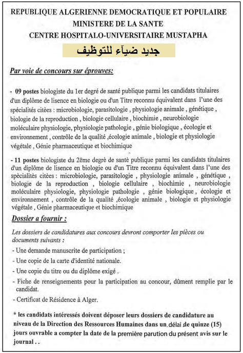 - بيولوجي من الدرجة الأولى للصحة العمومية 09 منصب