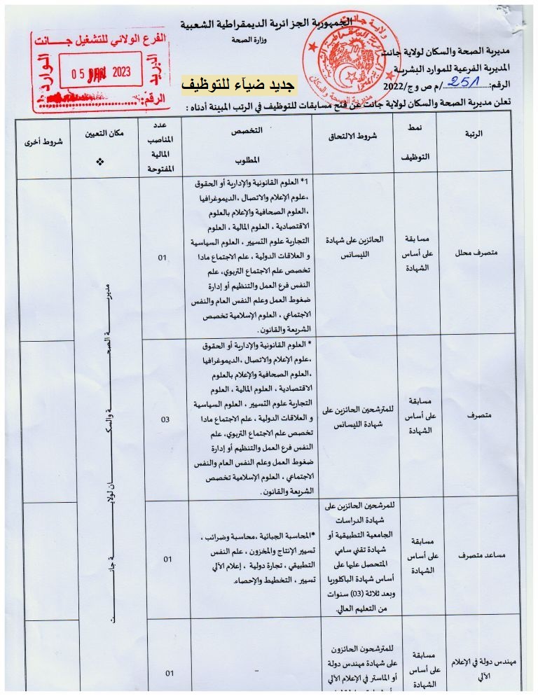 | اعلان عن توظيف بمديرية الصحة والسكان لولاية جانت |