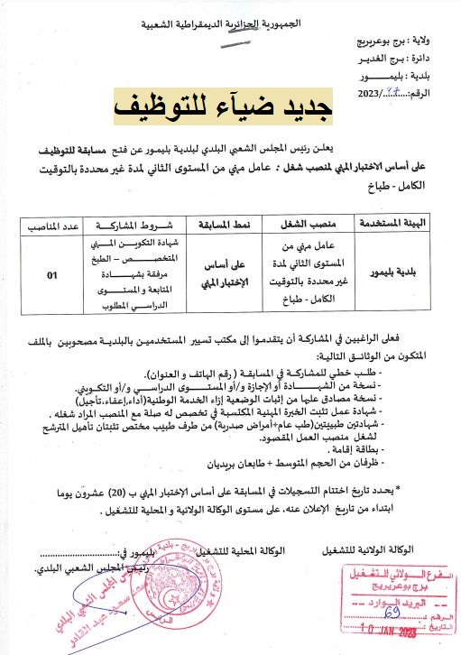 اعلان عن توظيف ببلدية بليمور بولاية برج بوعريريج