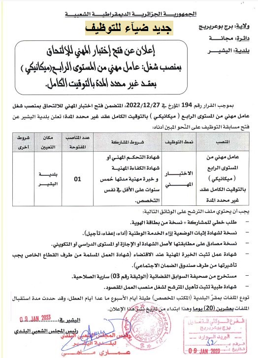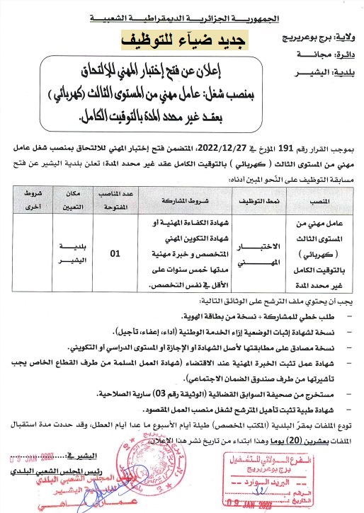 | إعلان توظيف ببلدية اليشير بولاية برج بوعريريج |