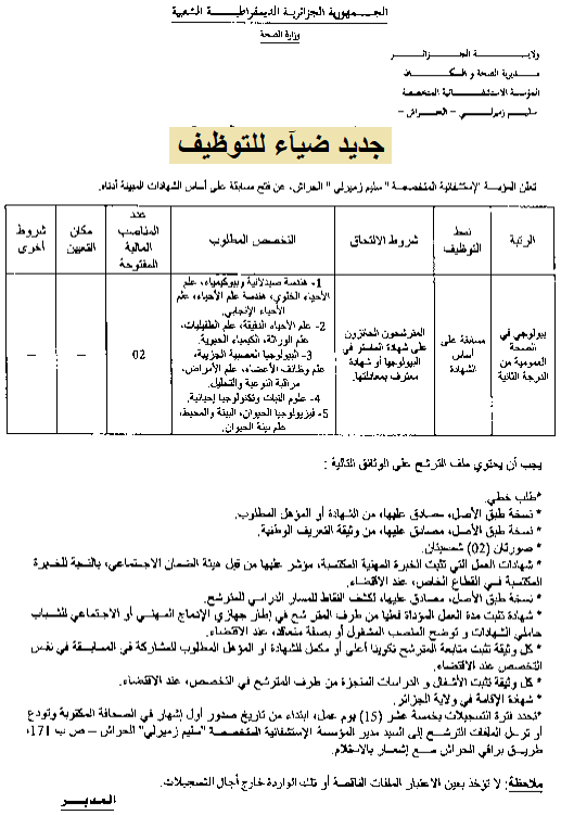 اعلان عن توظيف بالمؤسسة الاستشفائية المتخصصة سليم زميرلي بالحراش بولاية الجزائر