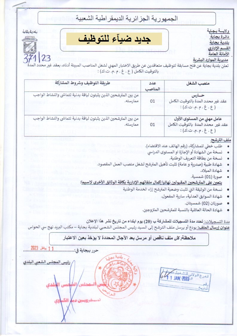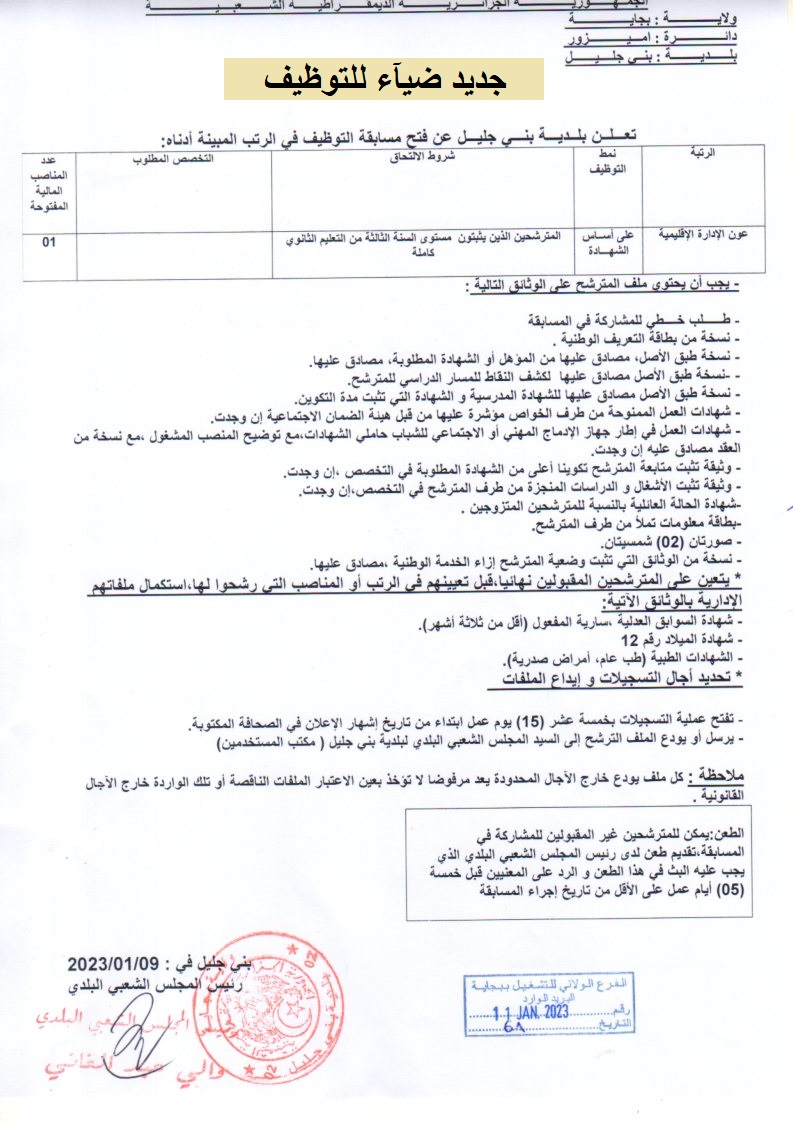| إعلان توظيف ببلدية بني جليل بولاية بجاية |