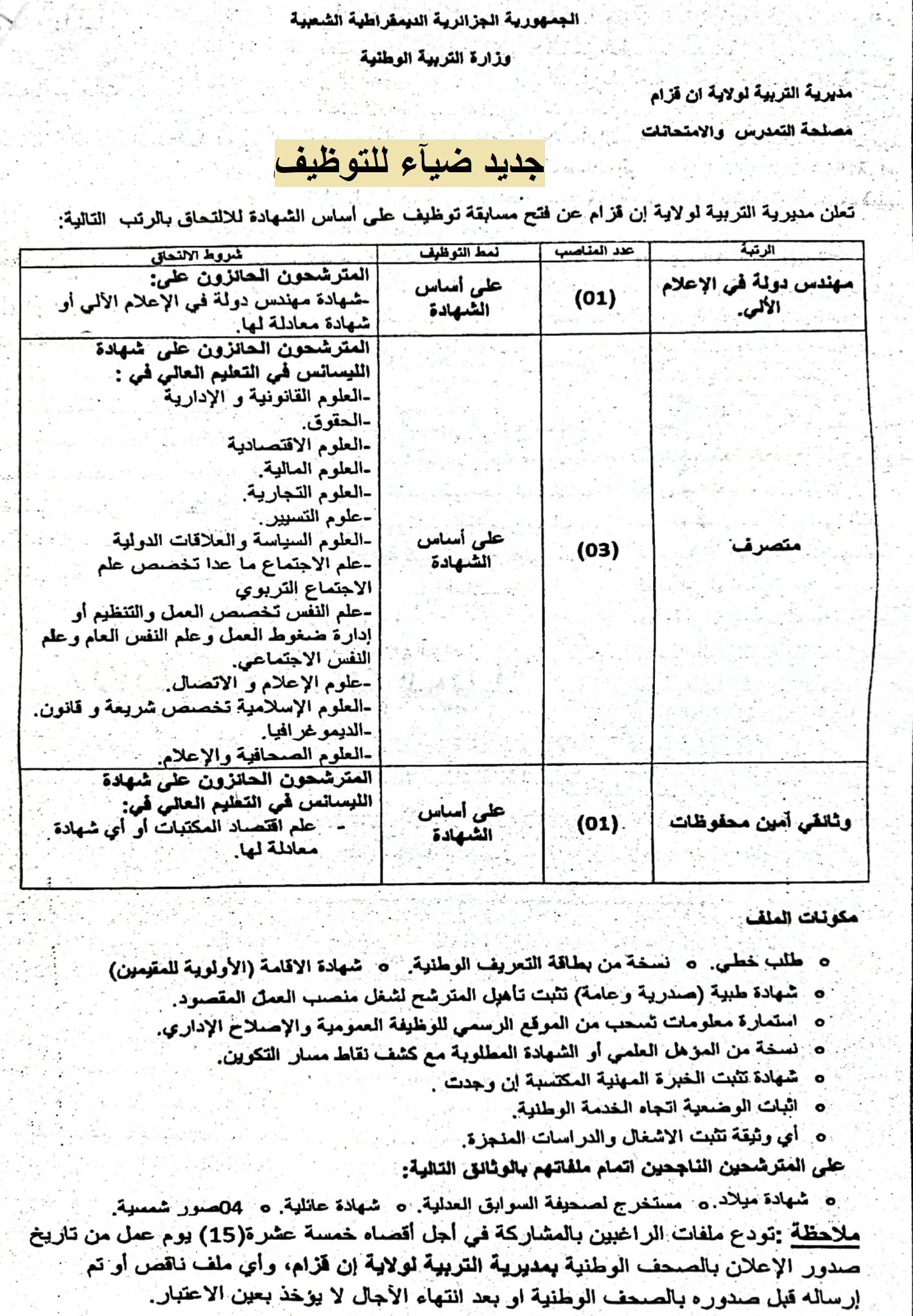 اعلان عن توظيف بمديرية التربية لولاية عين قزام