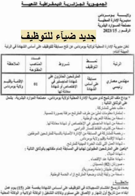 تعلن مديرية الإدارة المحلية تربية لولاية بومرداس عن فتح مسابقة على أساس الشهادة للتوظيف في الرتب المبينة أدناه: