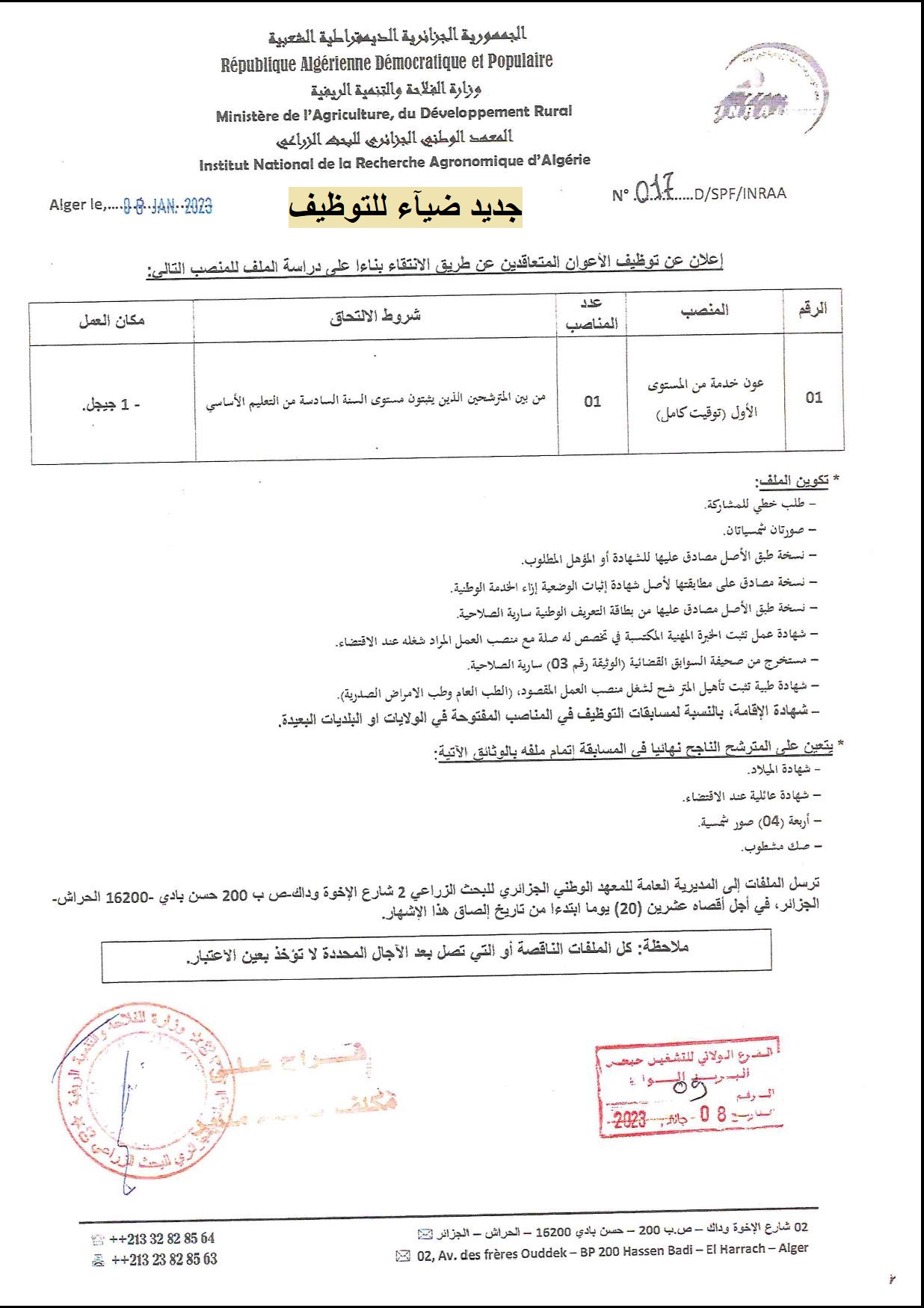 اعلان عن توظيف بالمعهد الوطني الجزائري للبحث الزراعي بولاية جيجل