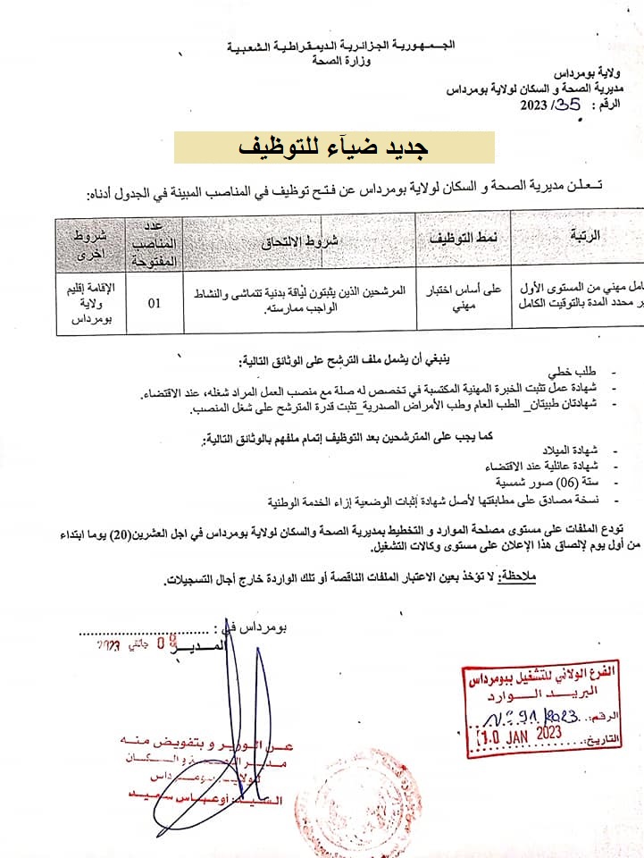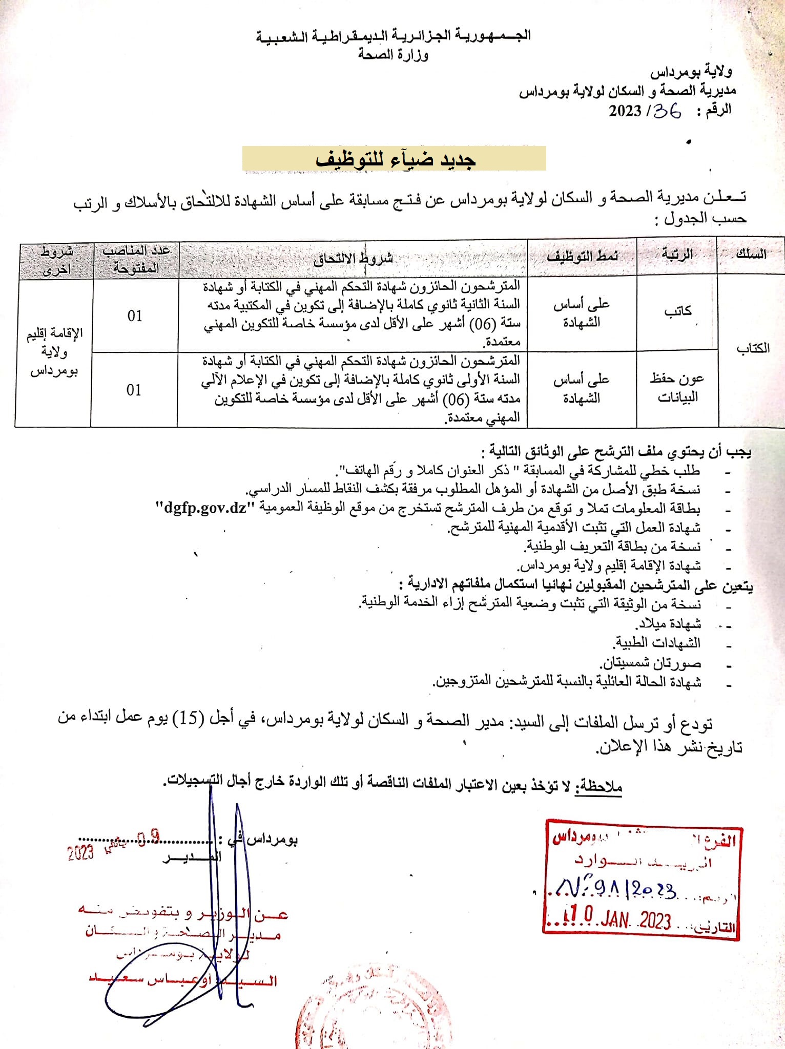 | اعلان عن توظيف بمديرية الصحة والسكان لولاية بومرداس |