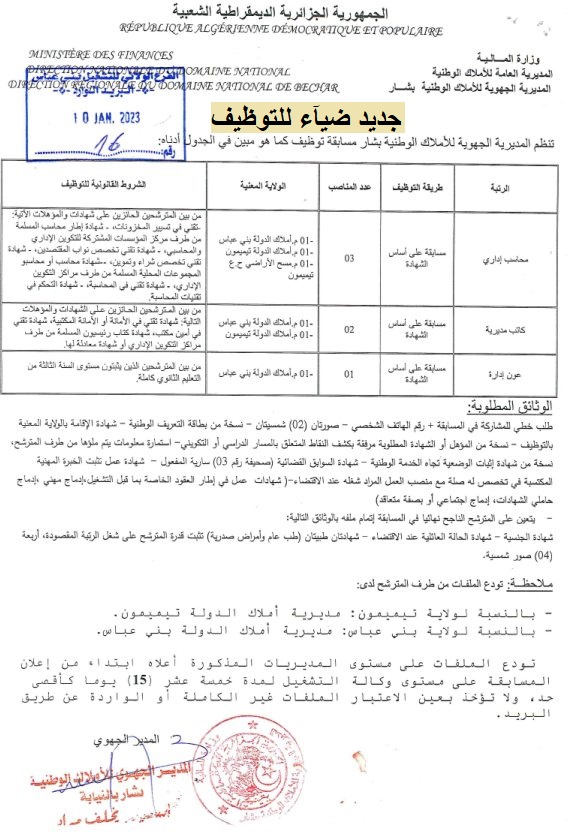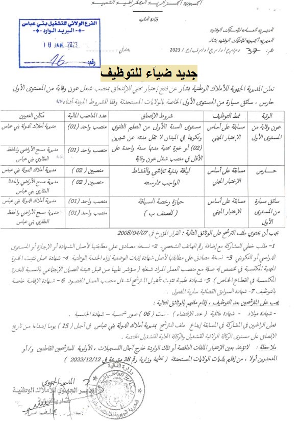 اعلان عن توظيف بالمديرية الجهوية للأملاك الوطنية لناحية بشار لفائدة ولاية بني عباس