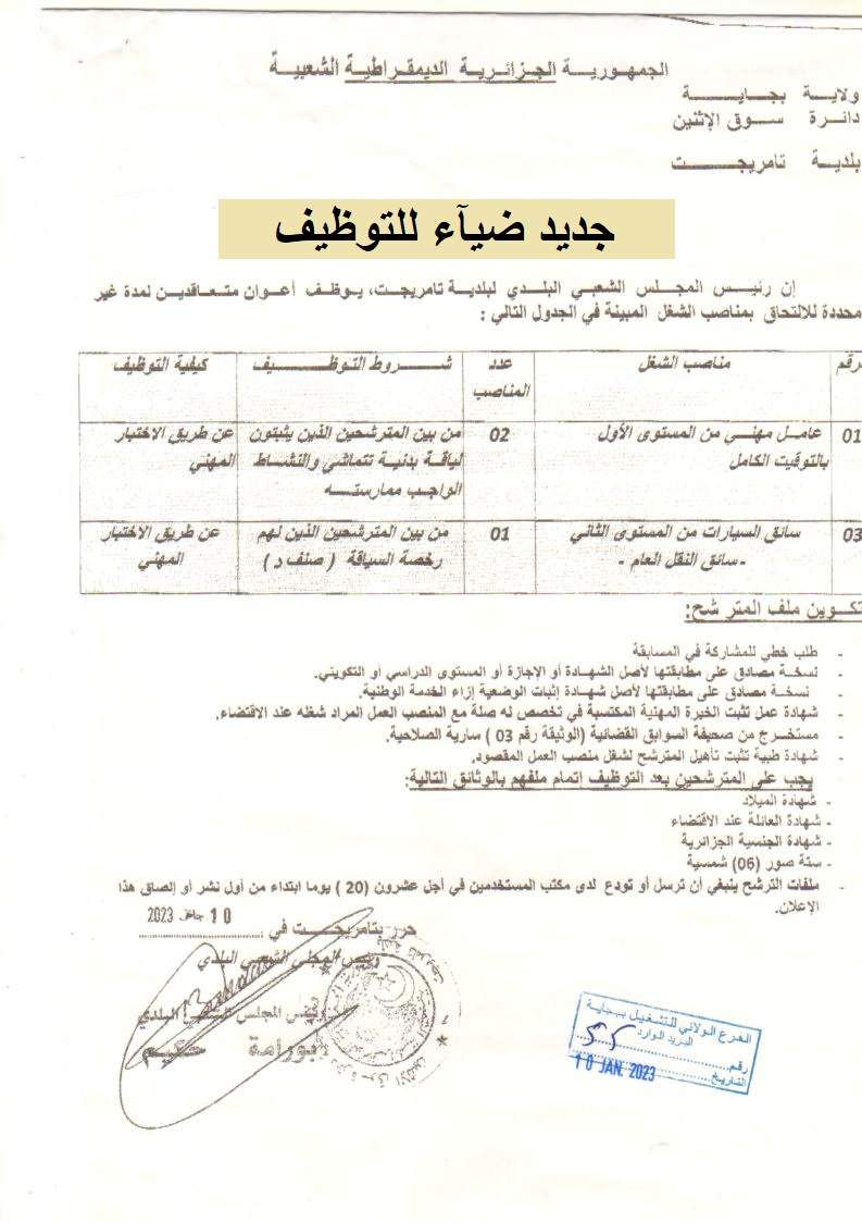 | إعلان توظيف ببلدية تامريجت بولاية بجاية |