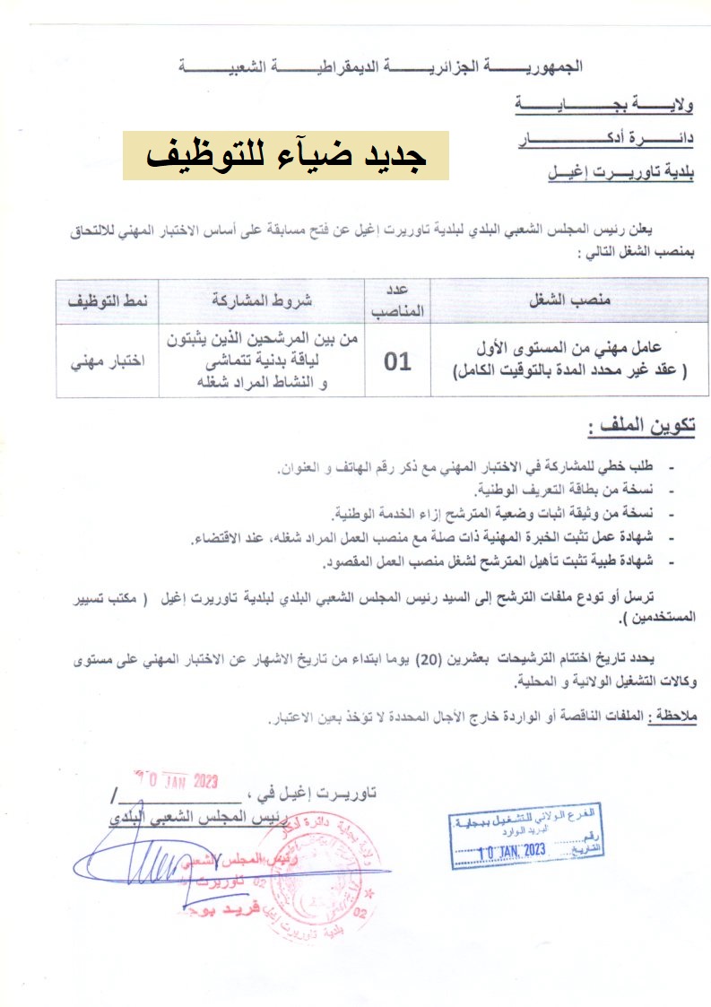 | إعلان توظيف ببلدية تاوريرت اغيل بولاية بجاية |