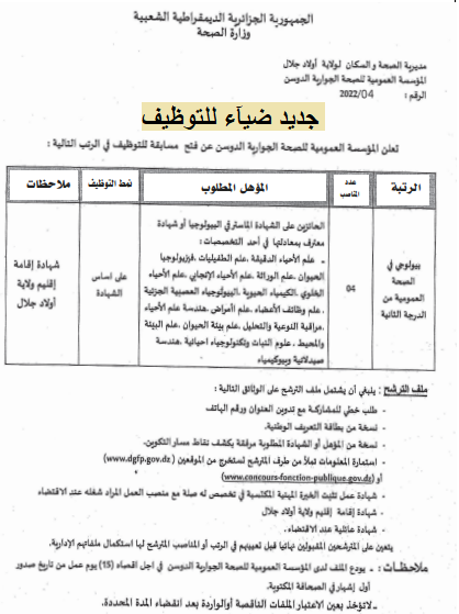 اعلان عن توظيف بالمؤسسة العمومية للصحة الجوارية الدوسن بولاية أولاد جلال