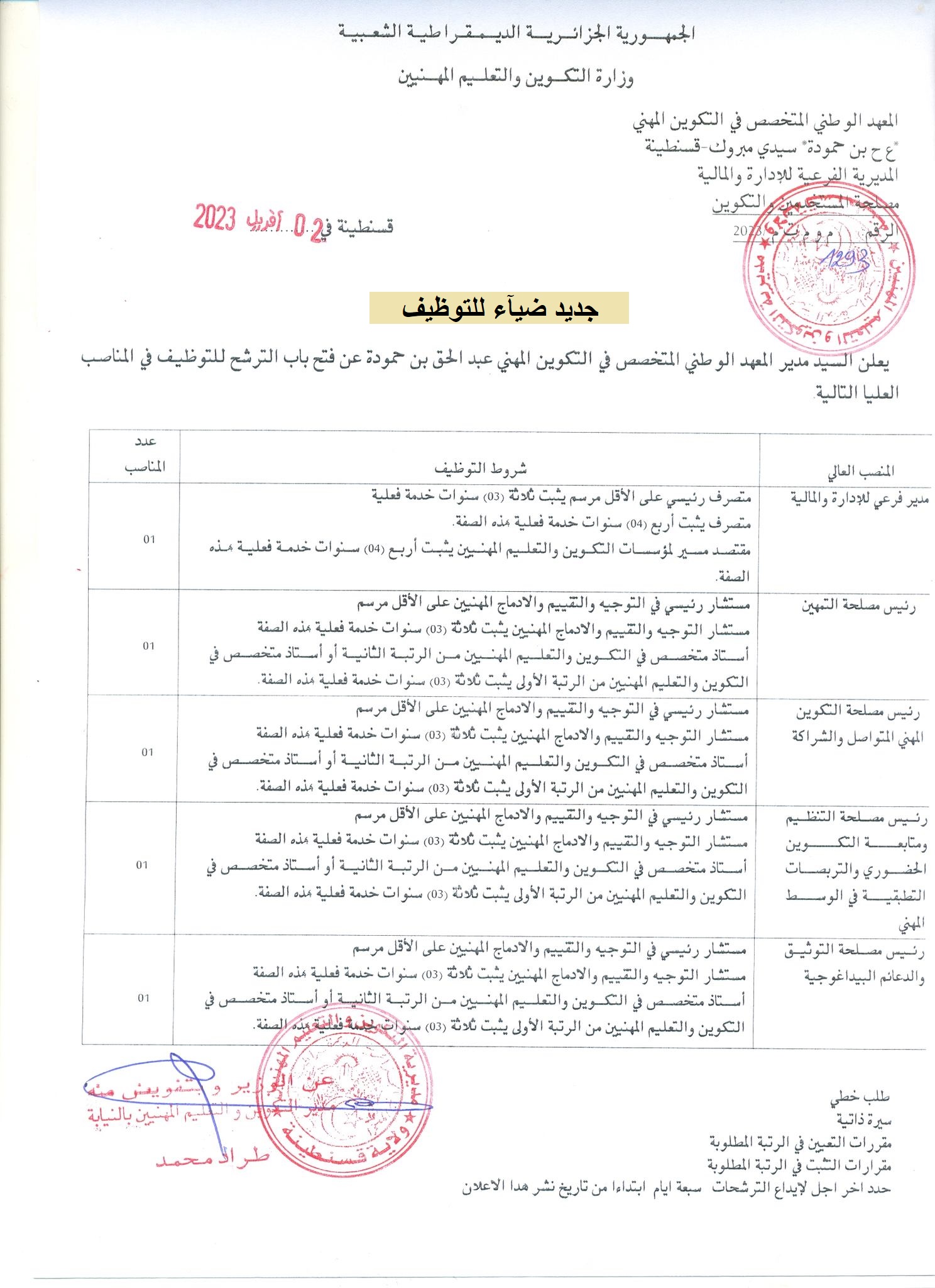 يعلن المعهد الوطني المتخصص في التكوين المهني عبد الحق بن حمودة بسيدي مبروك ولاية قسنطينة عن فتح باب الترشح للتوظيف في المناصب العليا المبينة أدناه: