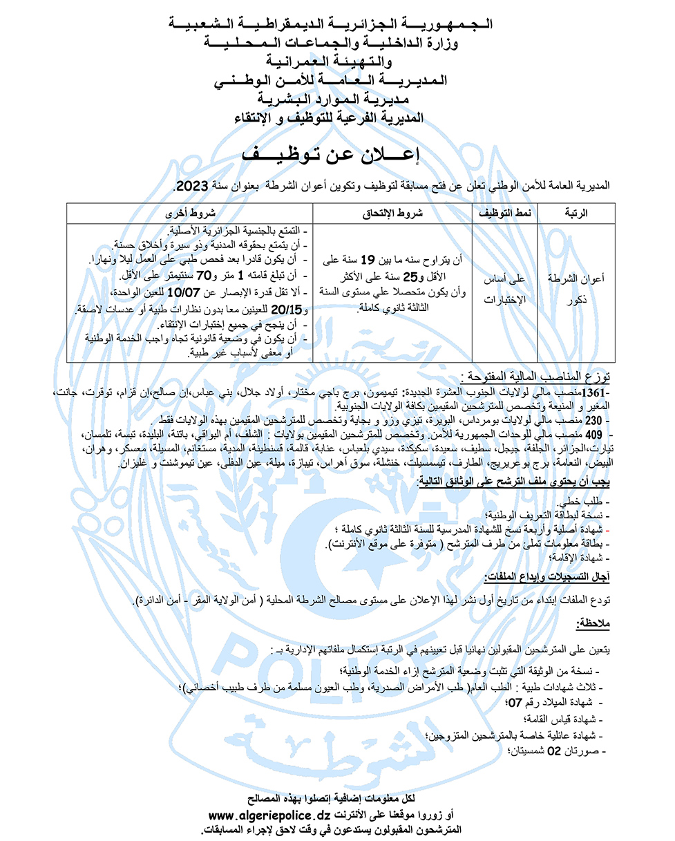 | اعلان عن توظيف 2000 عون شرطة بالمديرية العامة للأمن الوطني algerie police |