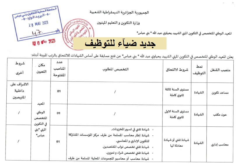 | اعلان عن توظيف بالمعهد الوطني المتخصص في التكوين المهني INSFP الشهيد يحياوي عبد الله بولاية بني عباس |